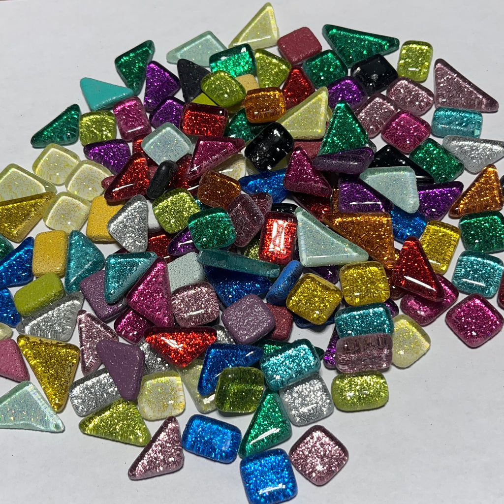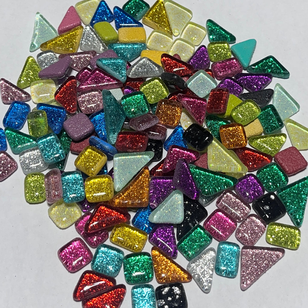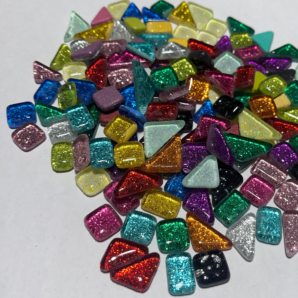 Cada pieza mide 10 x 10 mm y tiene un grosor de 4 mm. Es de vidrio transparente con purpurina en la parte posterior, lo que le aporta brillo y luminosidad. Se corta fácilmente con una pinza con ruedas. Estas piezas no son resistentes a los rayos UVA y se decoloran con la luz solar directa.